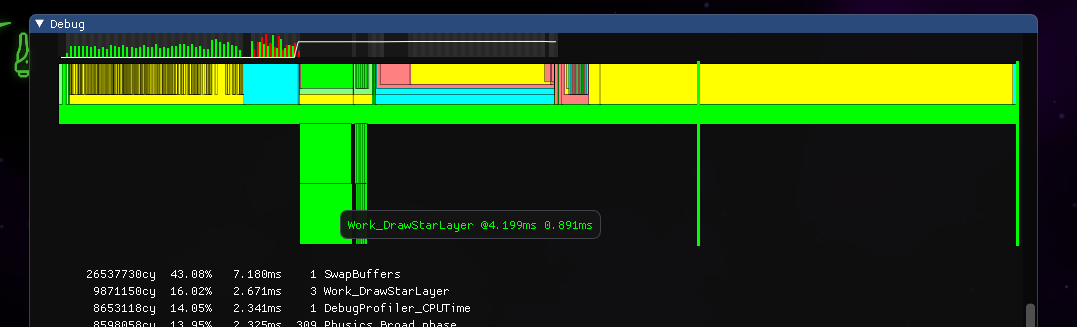 In-built CPU profiler of Asteroid Arena showing the 3 cores used (debug build).